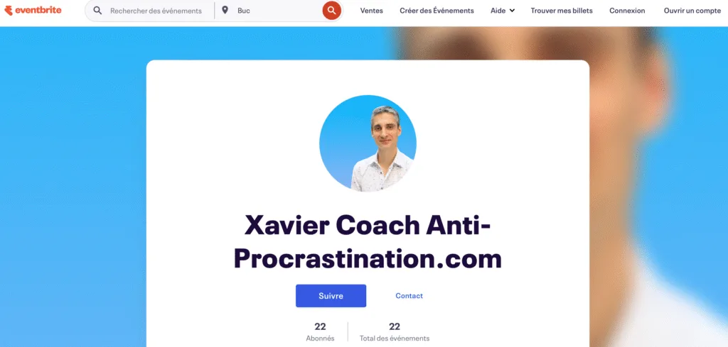 Si vous surfez sur EventBrite, suivez-y moi : https://www.eventbrite.fr/o/xavier-coach-anti-procrastinationcom-46577213073